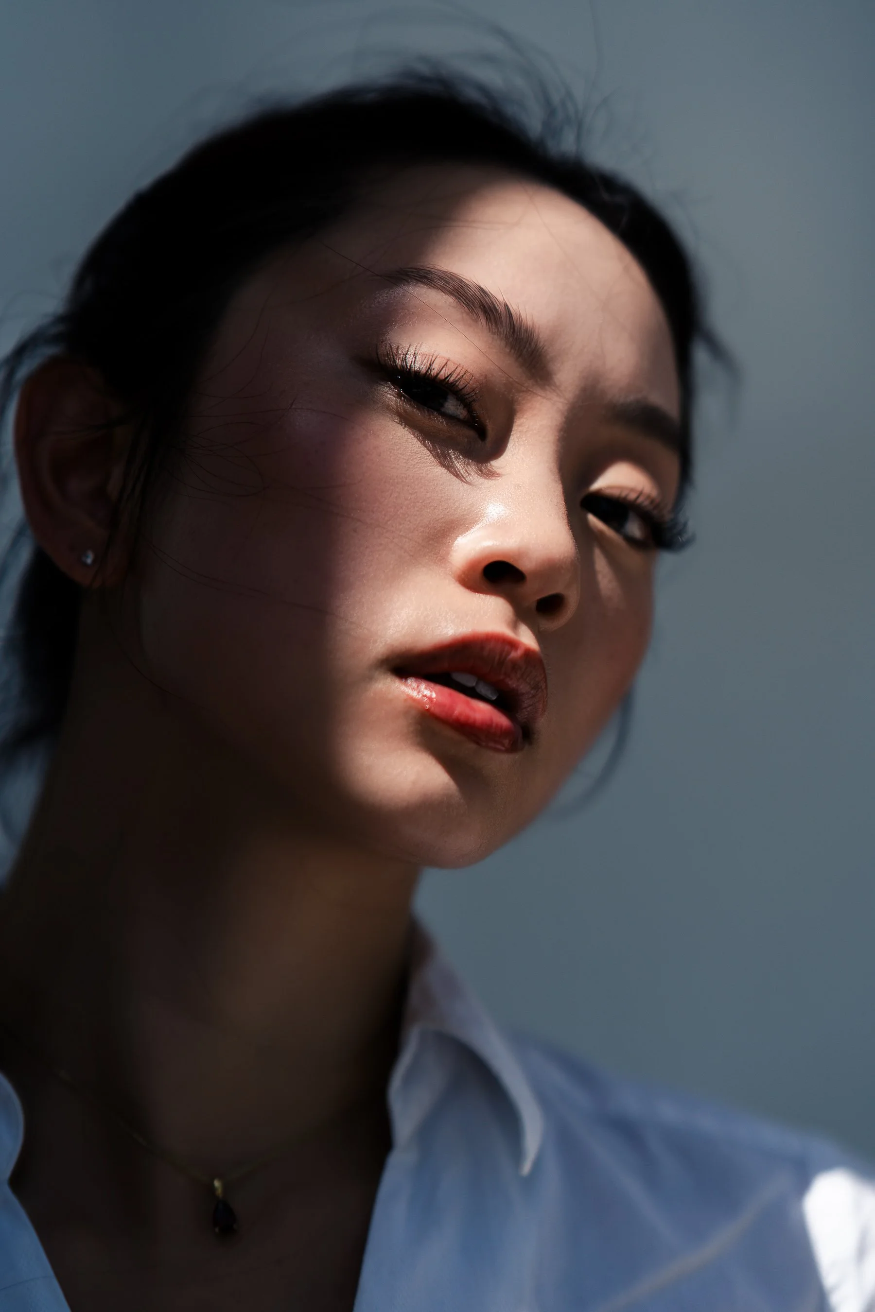 A close-up portrait of a woman with dark hair, fair skin, and makeup, with a shadow cast across her face.